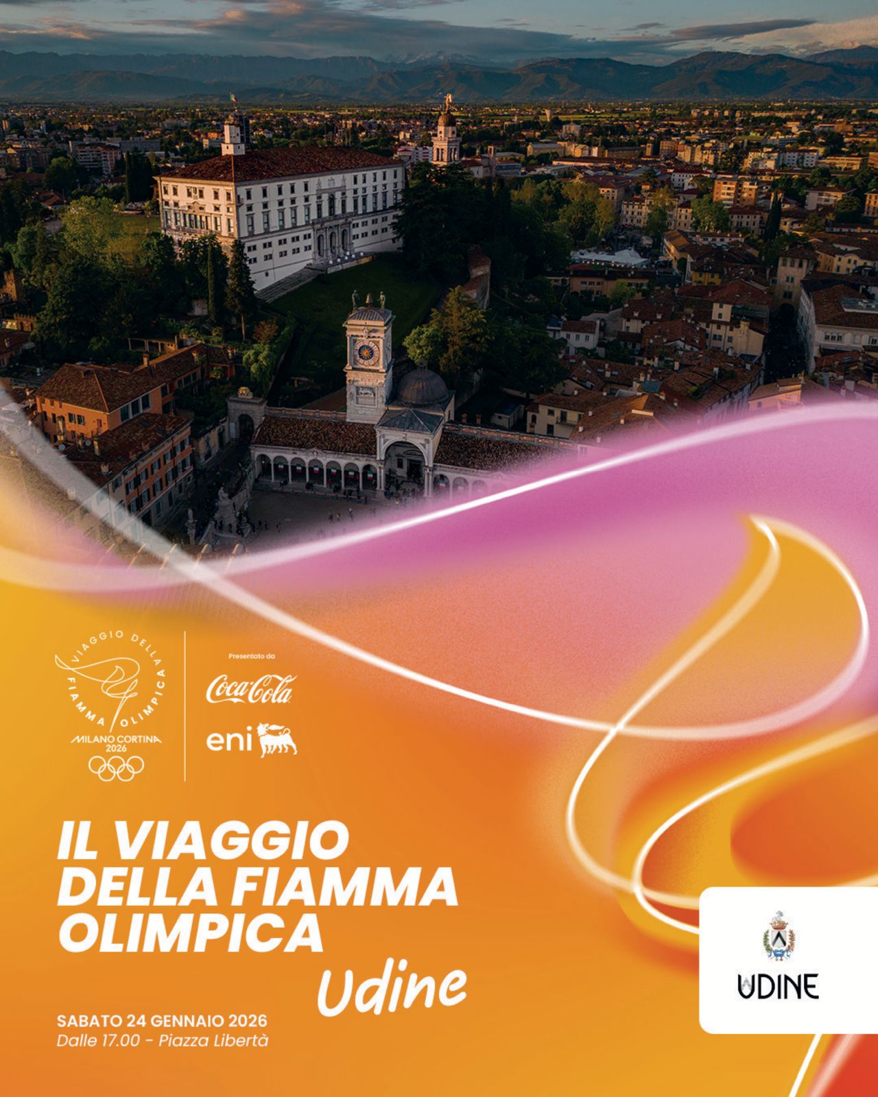 Sabato 24 gennaio Udine accoglierà la fiaccola olimpica di Milano-Cortina 2026. Il corteo, con 37 tedofori, percorrerà circa 8 km attraversando la città fino a piazza Libertà, dove sarà acceso il braciere olimpico. Tra i protagonisti: Michele Antonutti, Lodovica Comello, Luigi De Agostini, Mara Navarria, Rachele Sangiuliano, Venanzio Ortis, Tara Dragas e Alessia Tuttino.