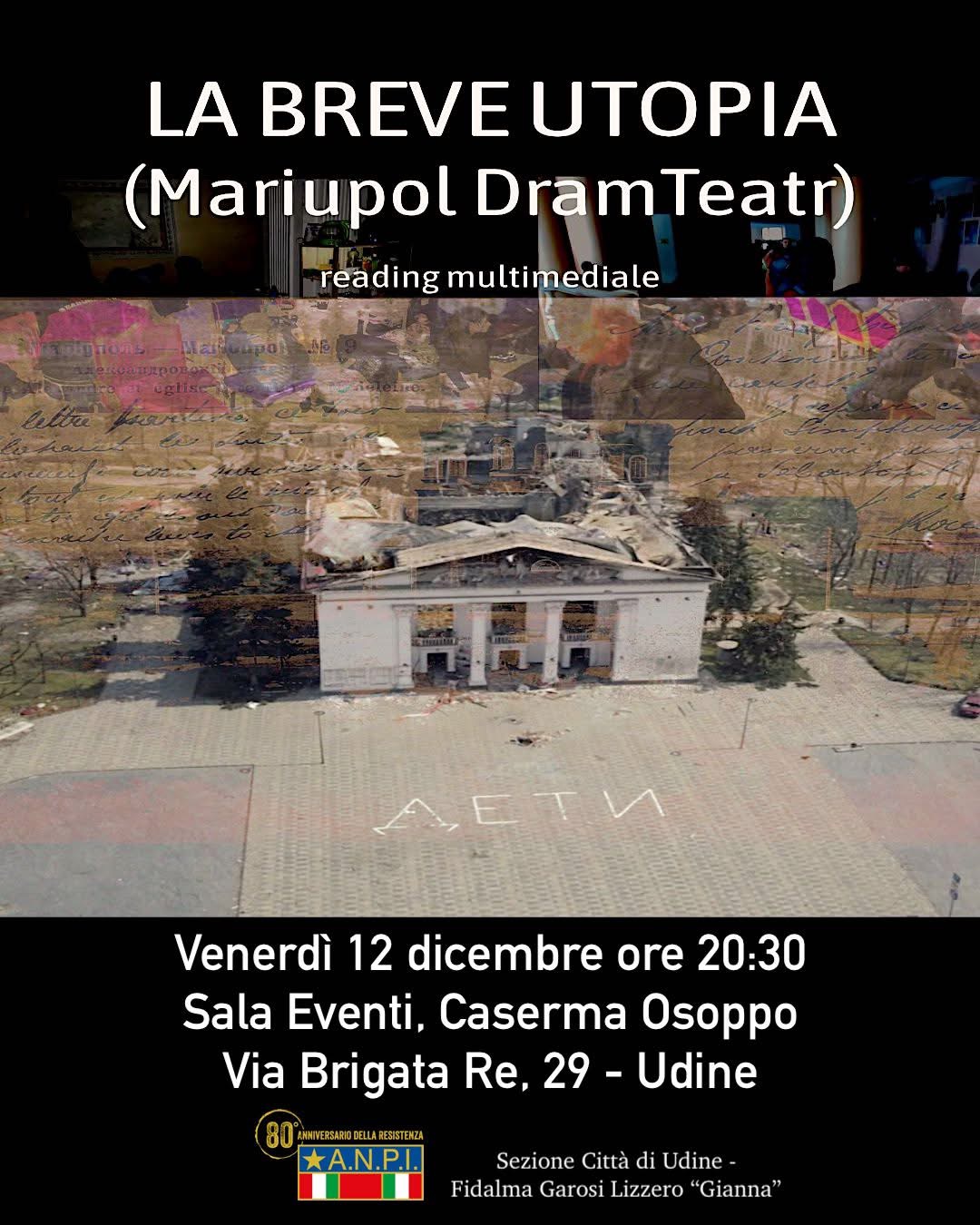 Domani, venerdì 12 dicembre alle 20.30, alla Sala Eventi della Caserma Osoppo (via Brigata Re 29, Udine), va in scena La breve utopia (Mariupol DramTeatr), reading multimediale a cura dello scrittore e attivista Michele Guerra (Max Stirner). Un racconto intenso di resistenza civile, nato sotto le bombe, che ci parla di dignità, cultura e solidarietà.